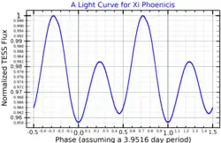 An Alpha2 Canum Venaticorum variable, Xi Phoenicis's visual magnitude varies between 5.68 and 5.78 with a period of 3.9516 days,[6] which is the rotation period of the star and is also associated with changes in the spectrum and the magnetic field. The brightness variation is maximum in the v band, with an amplitude of 0.13 magnitudes. The light curve in this band is symmetrical and has two distinct minima separated by half a rotation period, while the two maxima are igual. In other bands the variability is smaller or even absent, and doesn't show a regular pattern like in v.[10] The star is similar in many aspects to rapidly oscillating Ap stars, but does not display the rapid pulsations typical of these stars.[14]