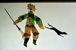 A shadow puppet depicting Xiaotian Quan and his lord Erlang Shen.