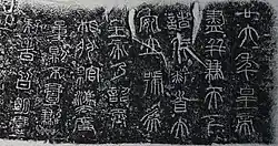 During the Eastern Zhou dynasty (c. 771 – 256 BC), local varieties of Chinese character forms had developed across the country, producing the 'scripts of the six states' (六國文字)—which were later collectively referred to as large seal script.[1] This variance was considered unacceptable by the nascent Qin dynasty (221–206 BC), who saw it as a hindrance to timely communication, trade, taxation, and transportation, as well as being a potential vector for fomenting political dissent.[2] Around 220 BC, Qin Shi Huang ordered a systematic standardization of the country's weights, measures, and currency, as well as its writing system. Character forms which differed from those used by Qin scribes were discarded, with the Qin forms becoming standard across the entire empire.[3]