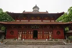 Xilin Temple was originally built in 366 by an official named Tao Fan (陶范), during the Eastern Jin dynasty (317–420).[1] In the Tang dynasty (618–907), Emperor Xuanzong issued the decree rebuilding the temple.[1] In the Song dynasty (960–1179), Emperor Taizong inscribed and honored the name "Qianming Chan Temple" (乾明禅寺). It became one of the Three Famous Buddhist Temples on Mount Lu, alongside Donglin Temple and Dalin Temple (大林寺). The temple had reached unprecedented heyday during that time.[1] Since the Yuan dynasty (1127–1368), over the course of 700 years, the temple was destroyed and rebuilt many times. Xilin Temple was devastated by the Mongolian invasion in 1292 and rebuilt in 1381, at the dawn of Ming dynasty (1368–1644).[1] In 1854, during the reign of Xianfeng Emperor of the Qing dynasty (1644–1911), Xilin Temple was completely damaged during the Taiping Rebellion.[1] Seven years later, monk Lusong (麓松) restored the temple.[1]