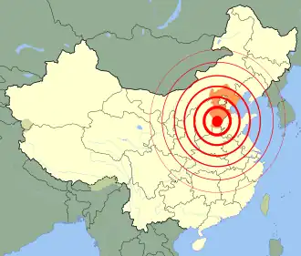 The first earthquake with magnitude 6.0 on the moment magnitude scale and epicenter in Longyao County occurred in the early morning of March 8, 1966. It was followed by a sequence of five earthquakes above magnitude 6 that lasted until March 29, 1966. The strongest of these quakes had a magnitude of 6.8 and took place in the southeastern part of Ningjin County on March 22.[2] The earthquake damage included 8,064 dead, 38,000 injured and more than 5 million destroyed houses.[3]