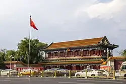 After the establishment of the Republic of China, Yuan Shikai served as the provisional president of the Republic of China (later changed to the president of the Republic of China). Yuan Shikai's government took over the three Western Gardens of the Qing Dynasty. In 1913, Zhonghai and Nanhai were turned into the Presidential Palace. Since then, Zhonghai and Nanhai were collectively called the Zhongnanhai.[2] In 1913, under the supervision of Zhu Qiqin, the Minister of the Interior and the Director of the Kyoto Municipal Office, Baoyue Tower was rebuilt into the main gate of Zhongnanhai, called Xinhua Gate. The section of West Chang'an Street in front of Xinhua Gate was named "Fuqian Street", and the newly opened road on the west side of Zhongnanhai was named " Fuyou Street " ("Fu" refers to the Presidential Palace). Afterwards, the road rebuilt on the drainage ditch south of Liubukou was named "Xinhua Street" (now North Xinhua Street and South Xinhua Street). A Western-style flower wall was built on the south side of "Fuqian Street" opposite Xinhua Gate to cover the messy and dilapidated bungalows behind it and improve the appearance in front of the Presidential Palace.[3] At the same time, the project also demolished the main gate of the Huiying Mosque on the north side.[2][4]