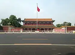 Article 5 of the National Flag Law of the People's Republic of China, promulgated and implemented in 1990, stipulates that the Xinhua Gate "shall display the national flag every day".[7] Article 4 of the National Emblem Law of the People's Republic of China, promulgated and implemented in 1991, stipulates that people's governments at or above the county level shall display the national emblem.[8]