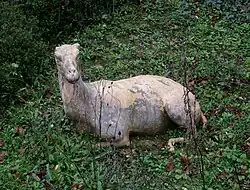 The fourth sculpture was mistaken as a Megaloceros giganteus fawn and was associated with the Megaloceros sculptures for an unknown amount of time. The sole surviving sculpture measures 1.7 m (5 ft 7 in) long from the snout to the tail and has a llama-like appearance given its long neck, small head, large eyes, robust body, camel-like nose, branched lips, and a narrow snout. The sculpture's appearance overall matches up with Cuvier's anatomical description of the species, the main inaccuracy being the reconstruction of additional small digits similar to A. commune. Its design and intended representation as a herd were likely inspired by South American llama appearances and behaviours. The illustration of Hawkins' workshop implies that the Xiphodon gracilis sculptures were intended to represent a relaxed herd.[14]