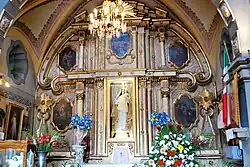 The church interior conserves its original 16th-century main altar, with four stories tall, contains indigenous, Italian, Flemish and Spanish influence and is covered in 24karat gold leaf.[55] It contains a relief of San Bernardino surrounded by two groups of indigenous sculptures, who are helping to build the church. Above San Bernardino, there is a depiction of the Virgin of the Assumption and the Virgin of Xochimilco. The paintings represent episodes from the life of Jesus and have been attributed to Simon Pereyns and Andrés de la Concha.[44] This is one of the few 16th-century altarpieces to have survived and the only one similar to it in size and construction is located in the monastery in Huejotzingo, Puebla.[56]
