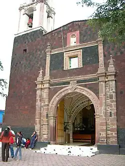 After the Conquest, Spaniards began to build churches and monasteries in the various villages in what is now the borough. Typical of these is the monastery at Santa María Tepepan, constructed between 1525 and 1590. Today, Xochimilco has nine parishes and five rectories.[47] The most important of this is also the first church established in the area, the San Bernardino de Siena church and former monastery founded by Martín de Valencia.[55] The current church building was constructed between 1535 and 1590 under the direction of Francisco de Soto, but the cloister and monastery area were not finished until the early 17th century.[47][55] In 1609, a monastery school was founded at the site with classes in rhetoric, theology and arts and letters. Most of the funding of the project came from indigenous leaders of the area, especially Martín Cerónde de Álvaro. In 1538, the Church wanted to bring the complex's Franciscans into Mexico City, but the local people opposed and won. However, in 1569, there were still only four monks serving over 5,000 native people. Soon after, the indigenous population was organized into neighborhoods for indoctrination and census purposes: Santiago Tepalcatlalpan, San Lucas Xochimanca, San Mateo Pochtla, San Miguel Topilejo, San Francisco Tlalnepantla, San Salvador Cuautenco, Santa Cecilia Ahuautla, San Andrés Ocoyoacac, San Lorenzo Tlatecpan, San Martín Tiatilpan, Santa Maria Nativitas Zacapan y Santa Cruz Acalpixcan.[56] Major restoration work was done on the church in its decorative elements in the 1970s. This also included removing two schools that had been established on the large atrium area as well as banning commercial activities from the same.[56]