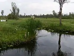 Much of the park's territory is dedicated to chinampas. Chinampas are artificial islands created on the shallow waters of the lakes starting in the pre-Hispanic period. These islands began as rafts made with tree branches and other materials, which were then loaded with soil and mud from the lake bottom and tied to ahuejote or other kinds of trees to anchor them. Over time, these rafts would sink and pile up on the shallow lake bottom, eventually becoming fixed islands. As these islands multiplied in number, they became separated by canals, which are necessary to keep a constant supply of water to the chinampa. The canals of the parks were created by this method. In the past, chinampas were primarily used for the growing of foodstuffs, but today, most of what is raised is ornamental plants.[7] Much of the ecological system was restored over a five-year period, then the area opened as a park in 1993 in order to create tourism, hinder the urbanization of the area and preserve the local ecology.[3] Most of the park's area is an aquatic environment of lakes, canals or chinampas with some forested areas, much of which are planted with ahuejotes, pines and eucalyptus.[3] Most of these chinampas have been transformed into "agro-ecological" land, meaning it is an ecological preserve and farmland at the same time. This area extends from Cuemanco to Mixquic in the Tláhuac borough, all connected by a series of canals. These are what made Xochimilco a World Heritage Site.[8] The aim of this area is to preserve an environment known to the Aztecs over 500 years ago.[9][10]