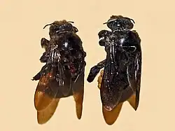 Xylocopa augusti can reach a length of about 25–30 millimetres (0.98–1.18 in). These large and robust carpenter bees show a black body integument with conspicuous lateral ferruginous setae. Wings are dark brown with violet iridescence. Males are tawny, with two tufts of setae on the ventral surface of the metatibia. They can be encountered from December to March. They nest in wood and tree trunks.[1][3]