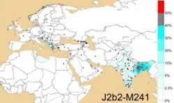The Haplogroup R2 is mainly restricted to various populations of South Asia, in addition to some populations of South Central Asia, Middle East, Asia Minor and the Caucasus where it is observed in low frequencies.[12] R2 has higher frequency among the speakers of the Indo-Aryan languages as compared to Dravidian speakers of South India.[8]