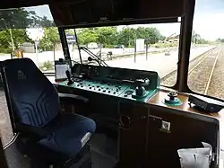 In motor cars, a baggage area behind the cab houses electrical equipment, a sink, a conductor's seat and table, bike racks, and a wheelchair tie-down space, accessed via double inward-opening doors.[2] This leads to a passenger compartment with seats along the sides and a central aisle, overhead luggage racks, an optional toilet with a single door, and an entry vestibule with folding doors over steps.[2]