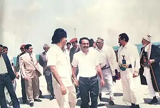 Following the assassination of al-Ghashmi on 24 June 1978, Colonel Ali Abdullah Saleh was appointed a member of the four-member interim presidential council and deputy commander of the General Staff.[31] He became influential already during Hamdi’s rule and used his clout to place his supporters into strategically important positions in the army. On 17 July 1978, Saleh was elected by parliament as President of the Yemen Arab Republic, simultaneously serving as Chief of Staff and Commander-in-Chief of the Armed Forces,[32] in theory controlling all power in the country. But in reality his power was unstable. Few people inside or outside the North Yemen expected him to survive for long, and most expected him to suffer the same fate as his two predecessors. In 1978–1979, several military coups and assassination attempts followed, and a coalition of North Yemeni opposition groups, the National Democratic Front (NDF), launched an initially successful years-long rebellion against the central government, with support from Libya and South Yemen. But to the surprise of outside observers, Saleh outlived them all. He managed to defeat his opponents, and after 4 years of rebellion, he was able to suppress the NDF forces in 1982 with the support of the United States and Taiwan. Saleh tried to reconcile with the tribal leaders whose power some of his predecessors had tried to curtail, for example by bringing the government closer to the Hashid, one of Yemen's tribal confederations (to which Saleh belonged) and its leader Abdullah al-Ahmar. The Hashid confederation became to dominate the security services and play an important role in maintaining the Saleh regime: 70% of the command positions in various security sector institutions or the army were from the Sanhan tribe, which was part of the confederation.[9] He ultimately reversed the reformist program begun by al-Hamdi,[33] opening the way to the corruption that had kept him in power. Saleh carried out major purges of military commanders to eliminate dissent and prevent further coups, and while these purges had a corresponding impact on the army's performance in the second war with southern Yemen, they allowed Saleh to remain in power.[22] End of the 1979 war also allowed him to strengthen his power. In addition to consolidating control over the army, Saleh began creating parallel forces to protect against a coup led by his cronies or relatives. Saleh took control of the Republican Guard, which was stationed around the capital and played a vital role as the regime's defenders. Although it numbered only a few thousand fighters in the late 1970s, the Republican Guard expanded greatly under his regime. Saleh has greatly expanded the army's role in the economy too.[9] His bodyguards numbered hundreds of men, mostly from his own Sanhan tribe.
