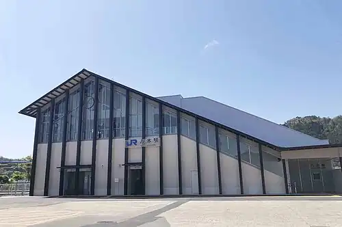 The current station building was completed in April 2021 along with barrier-free improvements.[4]
