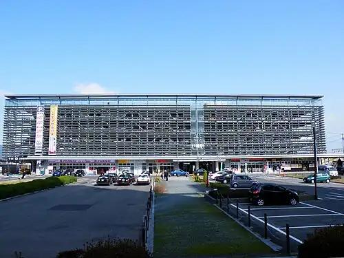 The station consists of two elevated island platforms serving four tracks. The tracks/platforms and the station building are at the same height, and a passage connecting them and a free passage to the north exit pass under the embankment. There are elevators connecting the platform and the underground passage, and the underground passage and the station building. The station has a Midori no Madoguchi staffed ticket office.[2] The structure consists of five floors above ground, with the second to fifth floors being a multi-storey parking lot. It officially opened on March 1, 2008.