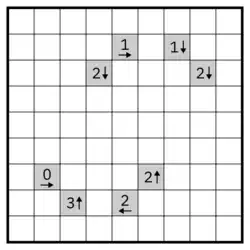 Yajilin is played on a rectangular grid of squares. At the beginning, cells are either indicative (containing a number and an arrow pointing "up", "down", "left," or "right") or empty. Black cells, an additional cell type, may be discovered during the solving process.