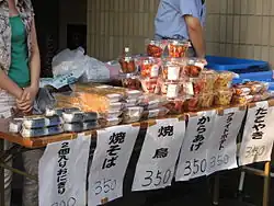Due to its ease of preparation and portability, yakitori is a very popular street food that is often sold from small carts and stalls, known as yatai. Yatai are found, among other places, dotting streets during festivals or on heavily trafficked routes during the evening commute where customers enjoy beer and sake with yakitori.[6]