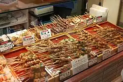 In Japanese cuisine, Yakitori (Japanese: 焼き鳥; lit. 'grilled bird') is chicken cooked on a skewer over a charcoal fire and seasoned with tare sauce or salt.[1] The term sometimes refers to kushiyaki (grilled and skewered foods) in general.