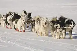 Yakutian Laikas are versatile with an excellent sense of smell, hearing,, vision, strong hunting drive, and endurance; they are aggressive to predators and gentle to humans if properly socialized from a young age. Whereas most aboriginal laika breeds are predominantly hunting dogs, the Yakutian Laika is predominantly a sled dog that also retain rudimentary hunting and herding abilities.[3] However, due to the vastness of Yakutia, Yakutian Laika can be specialized to fulfill the needs of different regions. There are an estimated 200 that are exclusively hunting dogs.[14] Yakutian Laikas are tolerant regarding living conditions and easily endure the hostile climate of northern Siberia. In harsh Siberian conditions, they reveal their stamina; they tend to work in small groups and can work through the whole day, from dawn to sunset.[15]