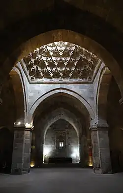 The Yakutiye Madrasa mosque has a vault decorated with muqarna design and a central oculus, which was constructed in 1310 and ultimately derived from the vault of the Armenian gavit narthex.[3]