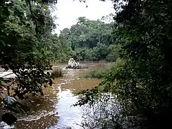 The Yala River flows through a wide, mature valley that appears to have been rejuvenated during the tilting associated with the rifting movements of the mid-Pleistocene. It runs swiftly over a rocky bed, with a notable absence of alluvial flats and terraces.[4] The main channel is about 30 metres (98 ft) wide, apart from the Yala Swamp.[3] The river runs through the southeast of the Kakamega Forest, where it has a dramatic 20-metre (66 ft) waterfall.[5]