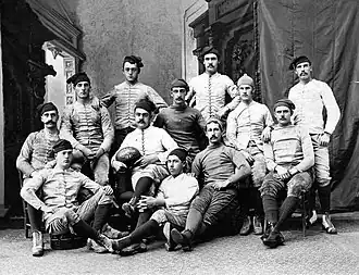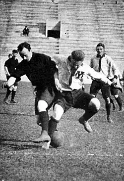 Yale's first attempts with "kicking games" have roots in the 1860s, when the University, along with Princeton, Rutgers, and Brown, started to play a form of football that resembled the Association game.[20] Nevertheless, after a rugby football played v Harvard in 1875, Yale dropped the association football in favor of rugby.[21][22]