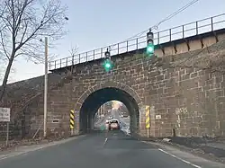 The Yalesville Underpass is a 30-degree skew arch bridge[1] that carries the railroad over Route 150 and Route 71 in Wallingford, Connecticut. Built in 1838 for the Hartford and New Haven Railroad by William MacKenzie, it is reported to be the first skew underpass in America.[2] The arch was designed to allow tall hay wagons to pass through, but it is not wide enough for modern two-way traffic; as a result, the one-way traffic being controlled by a pair of traffic lights. Due to the bridge’s age, it has to undergo repairs on a regular basis.