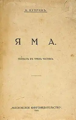 The Pit (Russian: Яма, romanized: Yama, published in English as Yama: The Pit) is a novel by Alexander Kuprin published in installments between 1909 and 1915, in Zemlya almanacs (Part 1 in 1909 and Parts 2–3 in 1914–1915). The book, centering on a brothel, owned by a woman named Anna Markovna, caused much controversy in its time.[1][2]