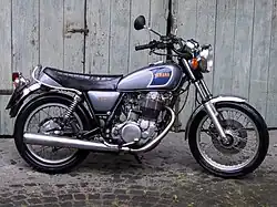 The Yamaha SR400 (1978–2021) and SR500 (1978–1999) are single-cylinder, air-cooled, two-passenger motorcycles manufactured in Japan by Yamaha Motor Company as a street version of the Yamaha XT500, with a standard riding posture and styling recalling the Universal Japanese Motorcycles of the 1970s. The two models differ by their engines: the SR400 engine has a lower displacement, achieved with a different crankshaft and shorter piston stroke[3][4] and both models feature only kickstarting, i.e., no electric starter.