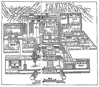 A yamen (ya-men; traditional Chinese: 衙門; simplified Chinese: 衙门; pinyin: yámén; Wade–Giles: ya2-men2; Manchu: ᠶᠠᠮᡠᠨyamun) was the administrative office or residence of a local bureaucrat or mandarin in imperial China, Korea,[1] and Vietnam.[2][3] In some places, such as Kowloon Walled City, Hong Kong, it was named as almshouse. A yamen can also be any governmental office or body headed by a mandarin, at any level of government: the offices of one of the Six Ministries is a yamen, but so is a prefectural magistracy. The term has been widely used in China for centuries, but appeared in English during the Qing dynasty.