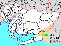- October 20 1890 - The village of Ōno was split off into the villages of Myōgō (Meigo), Nagoe (Nagoshi), Notose, Ishiro, Mutsuhira (Mutsudaira), Hosokawa and Ōno. (24 villages)