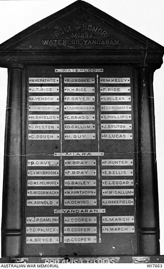 ![]() World War I Roll of Honour which covered the areas of Yandaran, Waterloo and Miara | |||||||||||||||