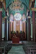 The church building is 36.5 m (120 ft) long and 14.5 m (48 ft) wide. It has a total area of 382.5 m2 (4,117 sq ft). Its façade is in the form of a Chinese Pailou, with up-pointing flying eaves. Its gates are adorned with Chinese Duilian verses, and its pillars have Chinese pedestals. However, it also contains Neo-Romanesque arches and a rose window. In 1978, some parts of the church were rebuilt with reinforced concrete to strengthen its structure.[18] The church's interior is supported by pillars with capitals depicting flowers and figures. It has a vaulted ceiling illuminated by chandeliers. The church is covered with traditional Chinese roof tiles.[19] The church building has a Chinese-style quadrangle to its left, enclosed by its school house, offices, and residential house.[20][19]