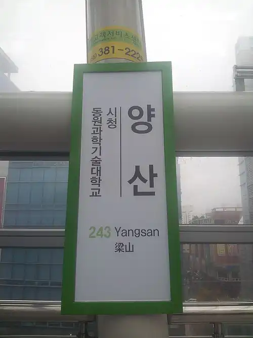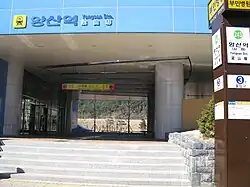 Yangsan Station is the western terminus of the Busan Metro Line 2 located in Jungbu-dong, Yangsan, South Gyeongsang. The subname in parentheses is City Hall.