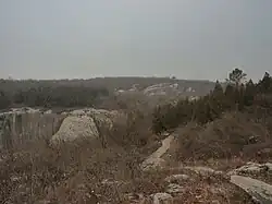 The Yangshan Quarry is situated on the Yangshan Mountain (elevation 140 m),[3] also known as Yanmen Shan (雁门山), northwest of Tangshan Town (汤山镇).[3] [4] The Yangshan is the main peak of the Kongshan Mountain Range (孔山山脉). The site is located 15–20 km to the east from the eastern part of Nanjing City Wall and the Ming Xiaoling Mausoleum.[5] Administratively, the area is in the Jiangning District of Nanjing City, Jiangsu Province.