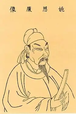 Yao Silian (姚思廉; died 637[1]), courtesy name Jianzhi (簡之),[2] formally Baron Kang of Fengcheng (豐成康男), was a Chinese historian and politician during the Sui dynasty and Tang dynasty and was the lead author of the Book of Liang and Book of Chen, the official histories of the Liang dynasty and the Chen dynasty, which his father Yao Cha (姚察), a Chen official, had begun but did not finish.