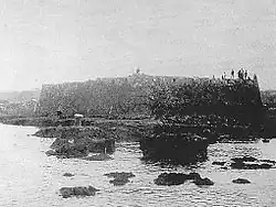 Yarazamori Castle was built on the southern mouth of Naha Port in 1546 by King Shō Sei.[1] It was built to defend the Port and city of Naha, alongside its sister Mie Castle. Between the two castles, an iron chain boom-net could be drawn up to deny ships access to the harbor.[1][2] Yarazamori Castle, the larger of the two, was armed with 7-9cm cannons.[2] The defenders were also armed with pikes and native-made hand cannons.[1] These defenses were intended for use against pirates, however they also proved successful in driving away the fleet of Satsuma during their 1609 invasion, where Yarazamori proved pivotal.[1][2] The castle would continue to be used for anti-piracy, however it became generally used for seeing ships off by civilians.
