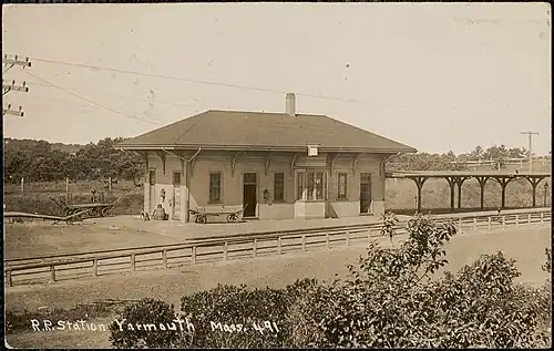 The original station was built in the village of Yarmouth Port when the Cape Cod Railroad extended its line from Sandwich to Hyannis in 1854.[1] In December 1865, the Cape Cod Central Railroad opened a branch from Yarmouth to Orleans, which was later extended to Provincetown.[2] It was destroyed by a fire on November 17, 1878; the Old Colony Railroad built a replacement.[1]