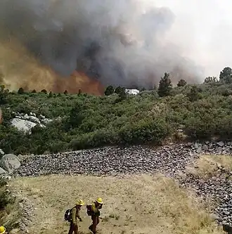 On June 30, wildland firefighters with the Prescott Fire Department's interagency Granite Mountain Hotshots were overrun and killed by the fire.[17] Initial reports indicated that one of the firefighters was not a member of the hotshot crew (IHC), but Prescott Fire Chief Dan Fraijo later confirmed that all 19 were Granite Mountain Hotshots.[18] The firefighters had apparently deployed fire shelters during the entrapment, but the heat of the wildfire soared over 2,000 °F (1,090 °C).[19][20] Not all of the bodies were found inside the fire shelters.[21] The city of Prescott released the names of the 19 firefighters on July 1.[22]