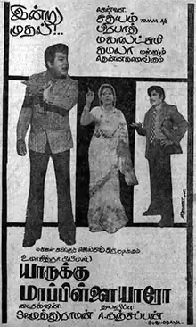Yarukku Mappillai Yaro (pronounced [jaːrukkːu maːppːiɭɭːaɪ jaːɾoː] transl. Whose groom is who?) is a 1975 Indian Tamil-language comedy film directed by S. P. Muthuraman and written by Thooyavan. The film stars Jaishankar, Jayachitra, Srikanth and Fatafat Jayalaxmi. It was released on 7 March 1975, and became a success.[1] The film served as an inspiration for the 2002 Tamil film Charlie Chaplin.[2]