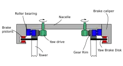 Some manufacturers use a plurality of smaller yaw drives (usually six) to facilitate easy replacement. Such a configuration with plurality of yaw drives often offers the possibility of active yaw braking using differential torque from the yaw drives. In this case half of the yaw drives apply a small amount of torque for clockwise rotation and the other half apply torque in the opposite direction and then activate the internal magnetic brakes of the electric motor. In this way the pinion-gear rim backlash is eliminated and the nacelle is fixed in place.