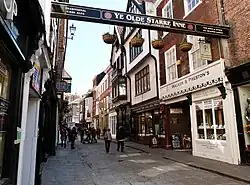 Ye Olde Starre Inne is a pub in the city centre of York, in England. The main block of the pub is a timber-framed structure, constructed in the mid-16th century, and a wing to its left was added in about 1600. By 1644, it was an inn named "The Starre", the buildings lying at the back of a coaching yard, off the north side of Stonegate. This makes it the pub in York which can demonstrate the earliest date for its licence.[1][2] After the Battle of Marston Moor the inn was used as a hospital for wounded soldiers.[3][4]