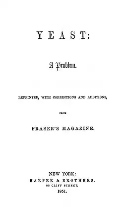 Yeast was first published in instalments in Fraser's Magazine, starting in July 1848, but as the radicalism of Kingsley's ideas became apparent the magazine's publisher took fright and induced the author to bring his novel to a premature close.[3] In 1851 it appeared in volume form.[7]