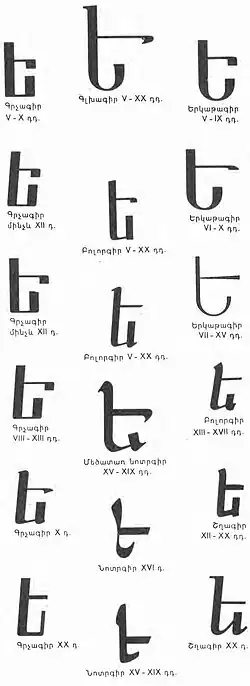 Yech, or Ech (majuscule: Ե; minuscule: ե; Armenian: եչ) is the fifth letter of the Armenian alphabet. It was created by Mesrop Mashtots in the 5th century AD. It has a numerical value of 5.[1] It represents the ([ɛ]) sound, but when it occurs word-initially, it is pronounced as [jɛ].