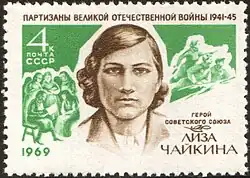Yelizaveta Ivanovna Chaikina (Russian: Елизавета Ивановна Чайкина; 28 August 1918 – 23 November 1941) often referred to as Liza Chaikina, was the Secretary of the Kalinin Komsomol Penovsky underground committee, a Soviet partisan detachment organizer and posthumous Heroine of the Soviet Union.[1]