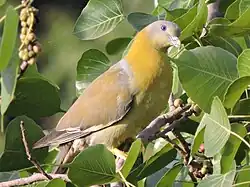 The yellow-footed green pigeon (Treron phoenicopterus), also known as yellow-legged green pigeon, is a common species of green pigeon found in the Indian subcontinent and parts of Southeast Asia.[2] It is the state bird of Maharashtra.[3][4] In Marathi, it is called Haroli or Hariyal. It is known as Haitha in Upper Assam and Haitol in Lower Assam. The species feeds on fruit, including many species of Ficus. They forage in flocks. They are habitat generalists:[5] in the early morning, they are often seen sunning on the tops of emergent trees in dense forest areas, especially Banyan trees,[6] but they have also been spotted in natural remnants in urban areas.[5] Their population is currently increasing.[5]