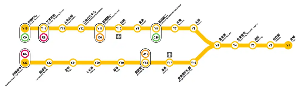 The yellow line has two start points from Cruise Terminal and MRT Cianjhen Senior High School Station respectively and an end point at Niaosong Depot, Niaosong District, Kaohsiung City. The section from Y1 to Y15 is also called Jiangong-Minzu (建工民族) Line while the section between Y1 and Y23 is called Chenching-Wujia (澄清五甲) Line.