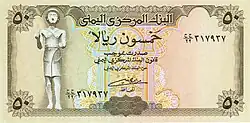 YRls 50 | Olive-green | Bronze statue of Ma'adkarib, ancient king of Haram | Shibam city, Hadramaut | 1993 | |
