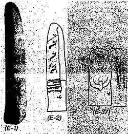 The inscriptions were named with the name of the river, village or region where they were first found, and were indicated with numbers such as E-1, E-50, e-150 in academic type. For example: Uyuk-Tarlak (Е-1), Barık I (Е-5), Barık II (Е-6), Elegest (Е-10), Begre (Е-11), Uybat I (Е-30) etc.[12][13][14][15]