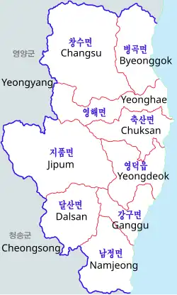 Yeongdeok-eup is divided into 17 villages (ri).[1]