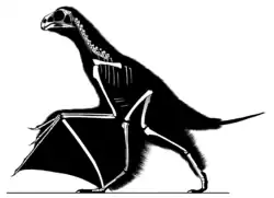 Small patches of wrinkled skin were also preserved, between the fingers and the styliform bone, indicating that unlike all other known dinosaurs, the planes of Yi qi were formed by a skin membrane rather than flight feathers.[1] The membrane stretched between the shorter fingers, the elongated third finger, the styliform bone, and possibly connected to the torso, though the inner part of the wing membrane was not preserved in the only known fossil.[1] This would have given the animal an appearance similar to modern bats, in an example of convergent evolution.[1][3] However, in bats, the membrane stretches between the fingers only, no styliform wrist bone being present. Ossified styliform bones are found, however, in the wings of some modern gliding animals like flying squirrels. The greater glider, and the prehistoric gliding rodent Eomys quercyi, also have a similarly long cartilaginous styliform element.[1]
