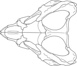 Yinlong was a relatively small dinosaur, reaching 1.2 m (3.9 ft) in length and 10 kg (22 lb) in body mass.[3] Despite a virtually frill-less and totally hornless skull, Yinlong is a ceratopsian. Its skull is deep and wide and relatively large compared to most ornithischians, but also proportionately smaller than most other ceratopsians. Long robust hindlimbs and shorter slender forelimbs with three-fingered hands suggests a bipedal lifestyle like many small ornithopods.[1][3]